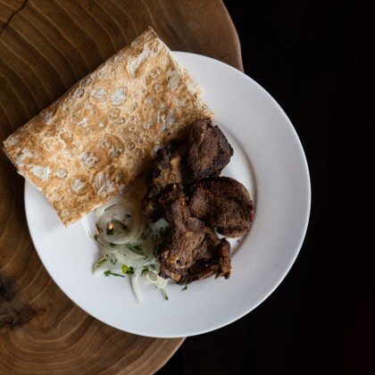 Фарш из мяса курицы, лаваш, томатный соус (20гр) , лук (15гр), зелень. (140гр без учета прожарки)