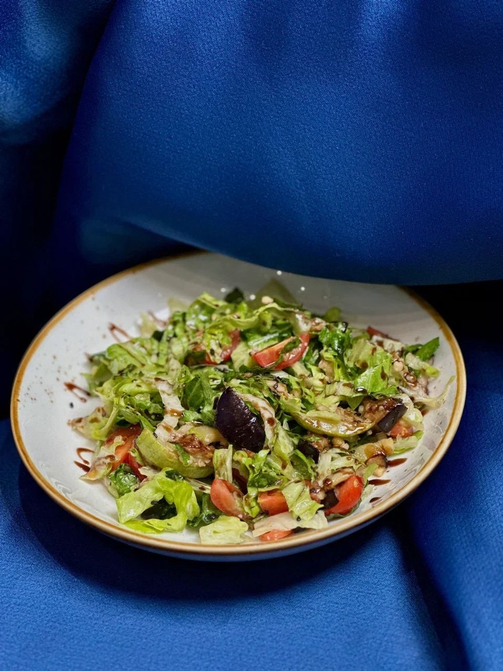 Романо,айсберг,баклажаны, кабачки, грецкий орех, черри, маслины, кинза, бальзамический уксус, сок лимона, оливковое масло (250 гр)