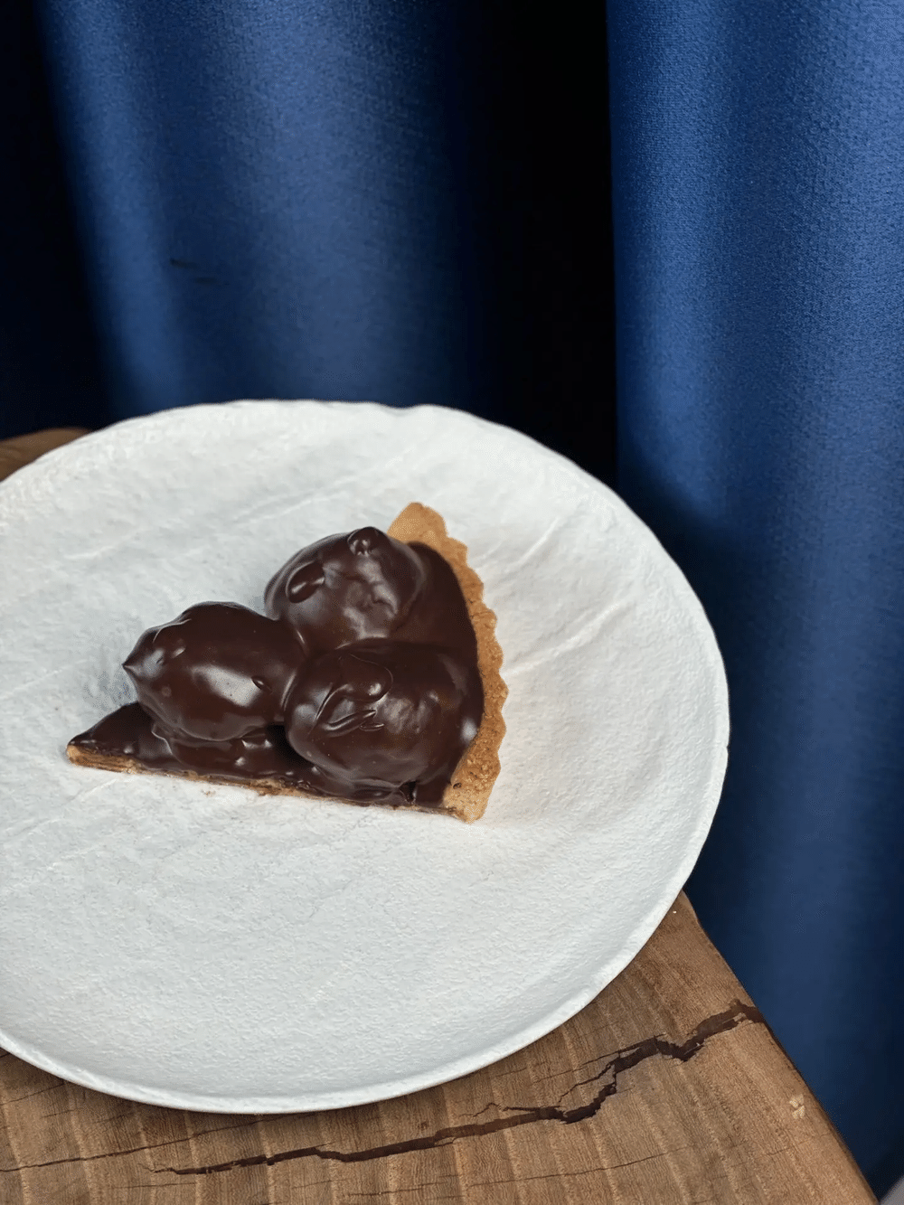 Песочное сабле, заварной ванильный крем, вишнёвое конфи, профитроли, нутелла, бельгийский молочный шоколад.