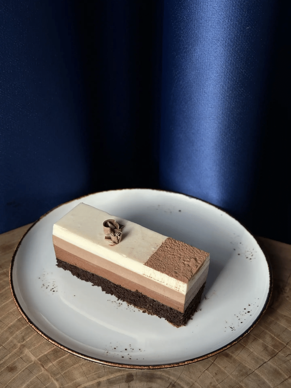 Шоколадный бисквит, муссовый тёмный шоколад, молочный шоколад, белый шоколад. 150 гр